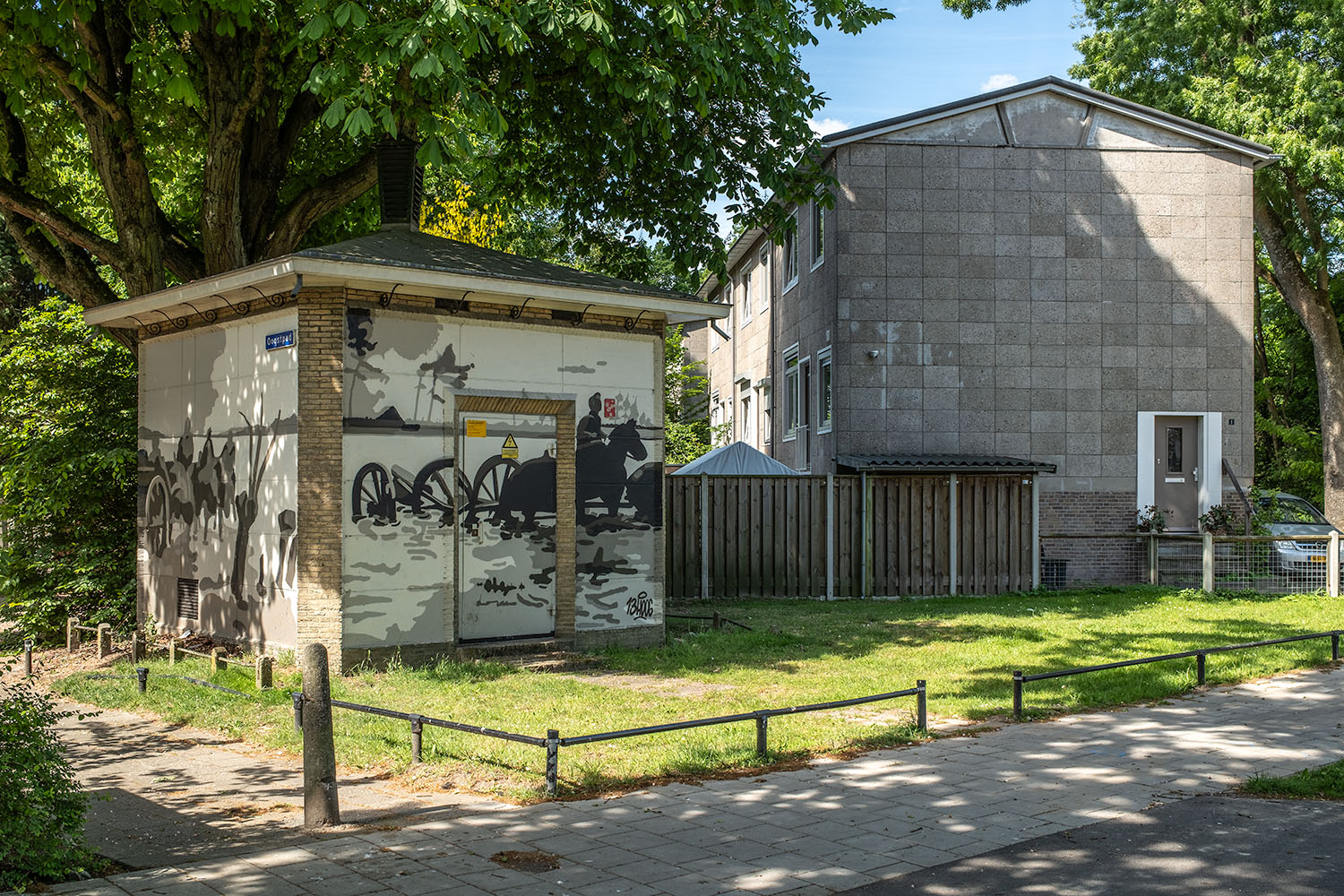 Het transformatorhuisje in Jeruzalem is in vijf dagen tijd beschilderd door graffitikunstenaar Daniël van de Haterd (hij signeert als 13Hoog). Het gaat om een afbeelding van de Grebbelinie en een oefening van de veldartillerie na het onderwater zetten van de Asschatterkom in oktober 1939. De militairen trekken de affuit van kanonnen door het onderwater gezette land. Een affuit is het onderstel van een kanon of ander zwaar vuurwapen. Je vindt ook een informatiebord bij het huisje, met meer informatie over de Grebbelinie.